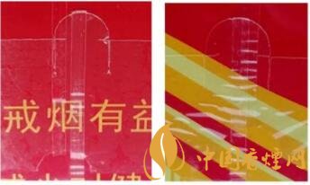 該款假冒卷煙暗黃色線條正面觀察非常清晰,完整。(圖2上真下假)